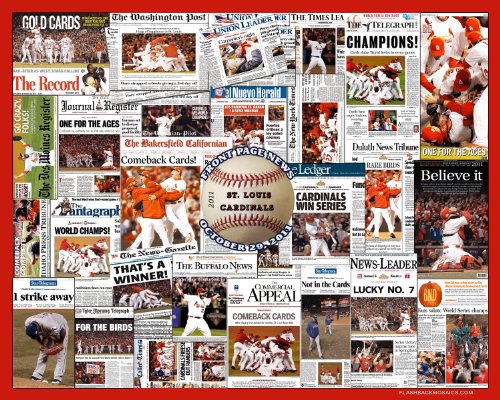 St Louis Cardinals, "One for the Ages", "Comeback Cards", "For the Birds".... These are just a few of the headlines in this full color, 16x20" high quality printed collage. Shown are 25 front-page newspaper headlines as published the day after the St. Louis Cardinals won the 2011 World Series. See and display how newspapers from various regions reported the Cardinals 11th World Series win!